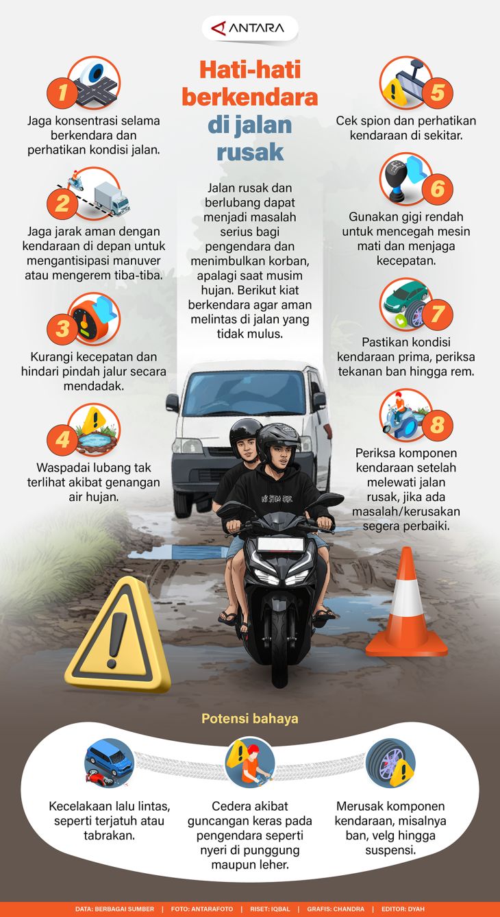 Jalan rusak dan berlubang dapat menjadi masalah serius bagi pengendara dan menimbulkan korban, apalagi saat musim hujan. Berikut kiat berkendara agar aman melintas di jalan yang tidak mulus.